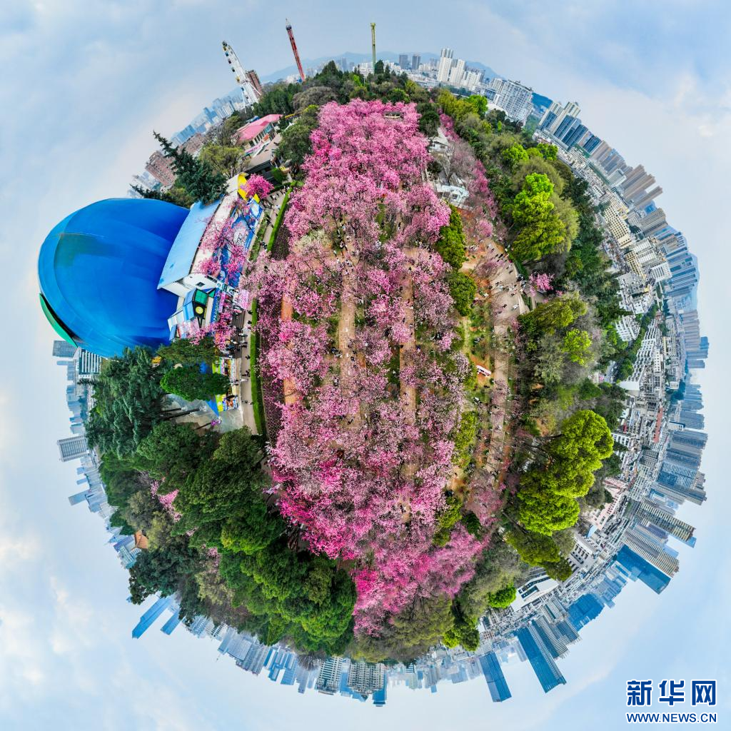 3月14日,云南昆明圆通山公园里盛开的樱花(无人机全景照片,3月14日摄)。新华社记者 胡超 摄