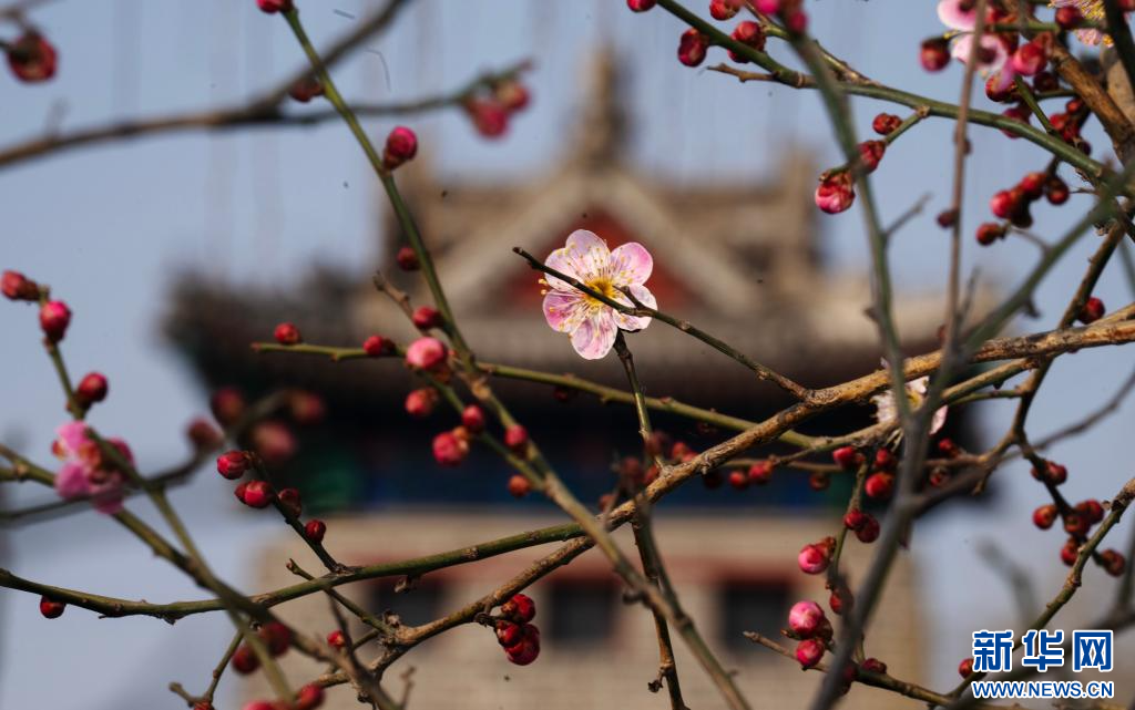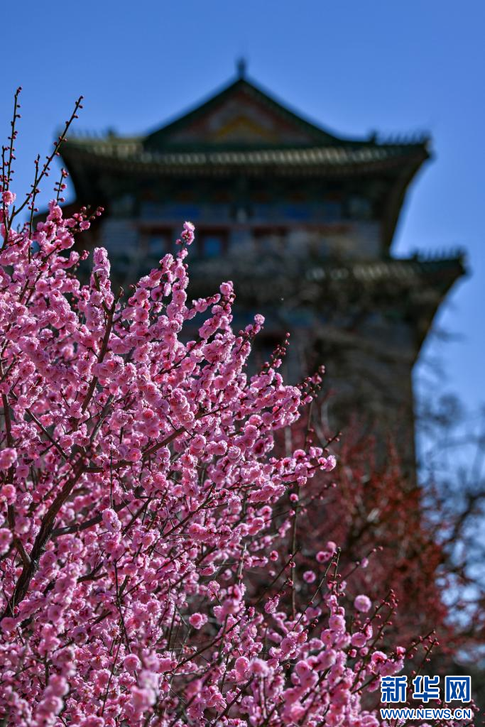 2025年3月5日,盛开的梅花与北京左安门角楼相映生辉。新华社记者 费茂华 摄