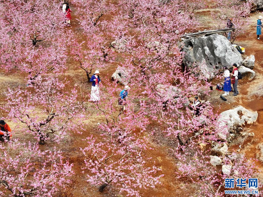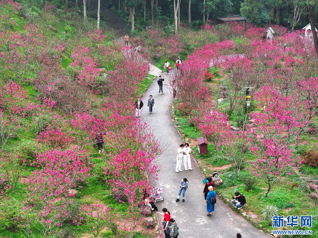 3月13日,游人在广西南宁市青秀山景区桃花坞景点观赏绽放的桃花(无人机照片)。新华社发(喻湘泉 摄)