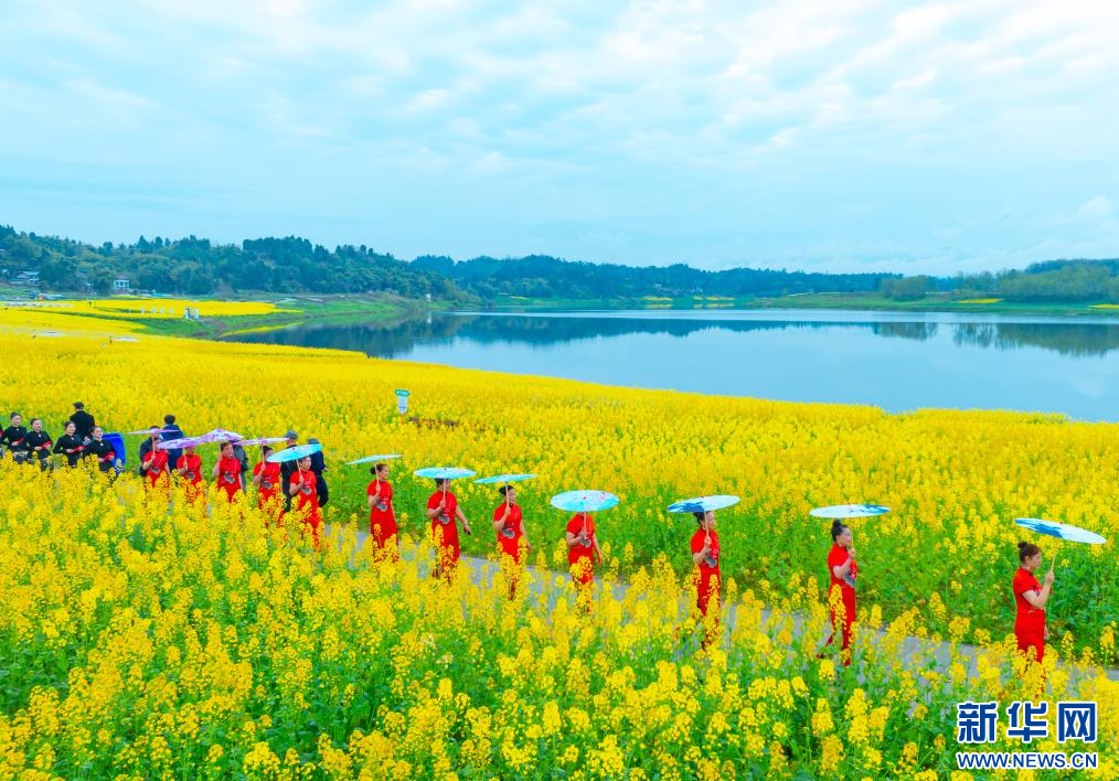 3月15日,在四川省广安市广安区肖溪镇,市民在油菜花丛中走旗袍秀(无人机照片)。新华社发(邱海鹰 摄)