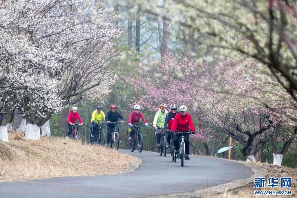2月27日,人们在浙江省湖州市长兴县太湖梅花博览园骑行游玩。新华社发(谭云俸 摄)