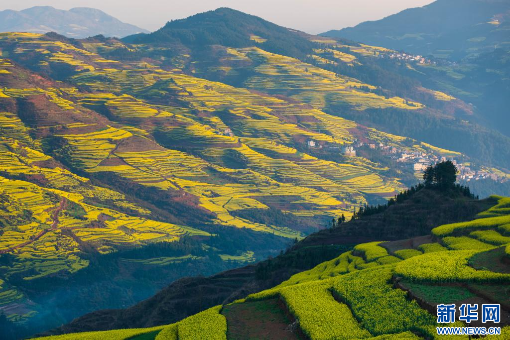 3月11日在云南省罗平县马街镇革岗村拍摄的大片油菜花田。新华社发(彭奕凯 摄)