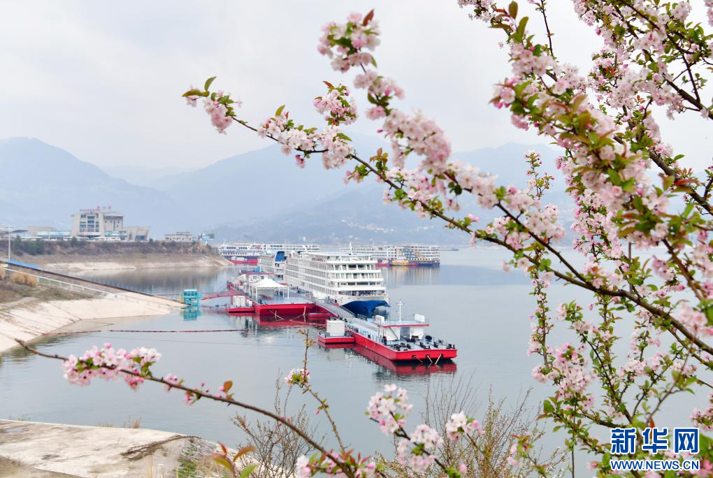 3月15日,船舶停靠在三峡大坝附近的湖北省宜昌市秭归县水域,沿江两岸春花烂漫。新华社发(王辉富 摄)