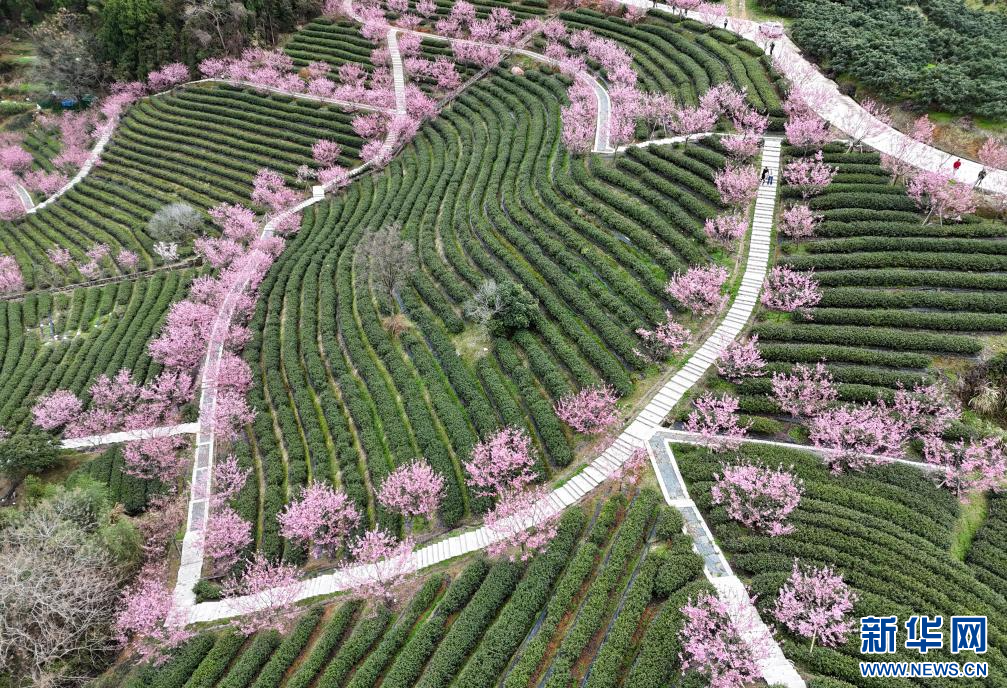 3月15日,游客在浙江省乐清市大荆镇下山头村茶山赏樱游玩(无人机照片)。新华社发(蔡宽元 摄)