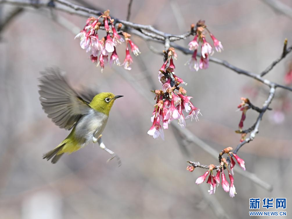 2月9日,绣眼鸟在福建省宁德市霞浦县玉潭樱花谷生态科技园觅食樱花蜜。新华社记者 姜克红 摄