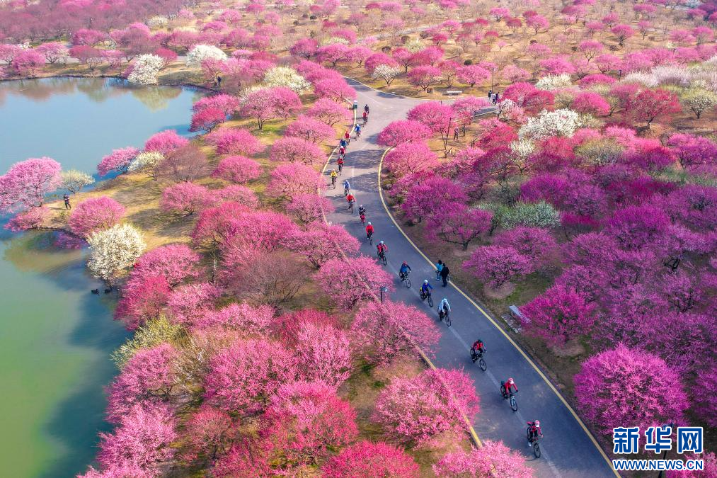 3月2日,在浙江省湖州市长兴县太湖龙之梦东方盆景园,骑行爱好者们骑行赏梅(无人机照片)。新华社发(吴拯 摄)