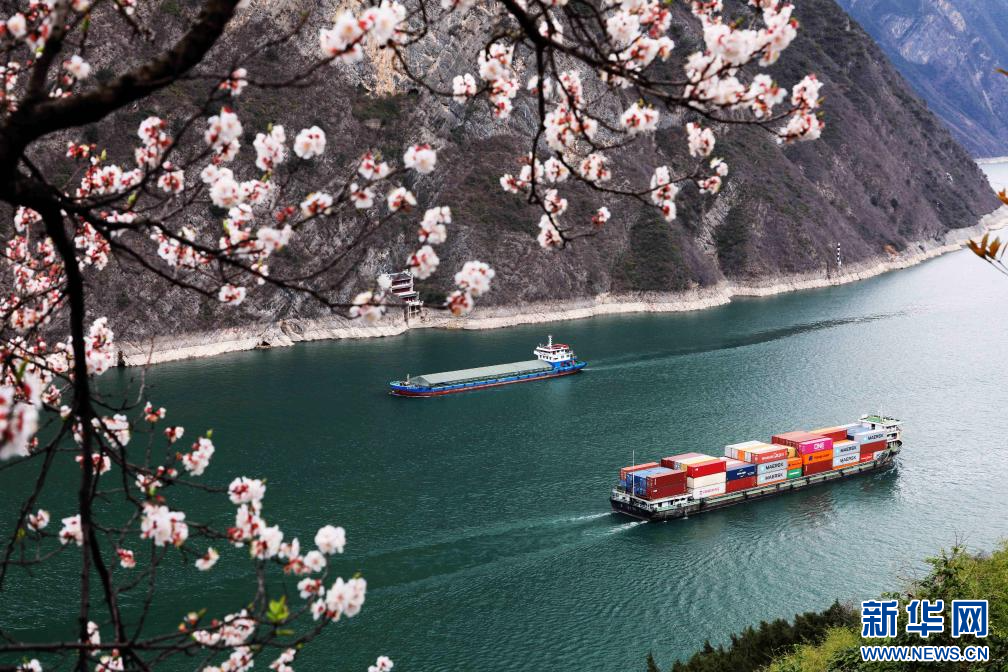 3月15日,船只航行在春花映衬下的重庆市巫山县长江巫峡水域。新华社发(王忠虎 摄)