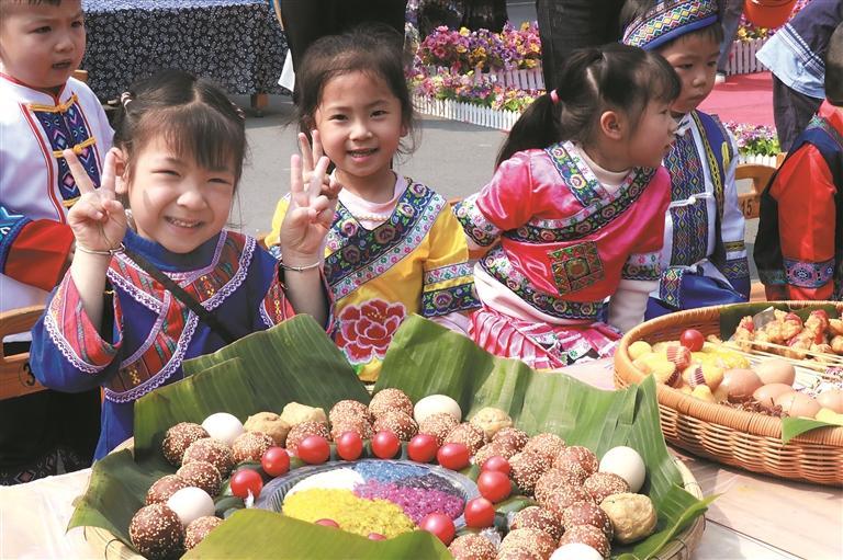 柳江区机关幼儿园的小朋友们体验民俗美食。 本报通讯员 熊敏珍 摄
