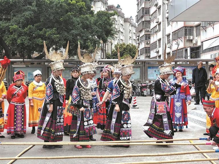 拉堡镇各族群众跳竹竿舞。 本报通讯员 彭晓文 摄