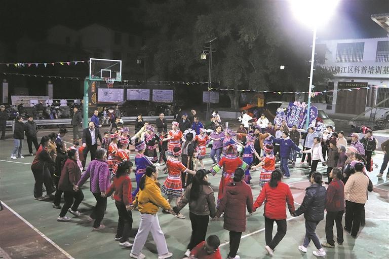 热闹的喜庆氛围也洋溢在柳江区各个乡镇。百朋镇怀洪村下伦屯举办“传承民族文化,促进民族团结”庆祝活动,将移风易俗知识内容融入活动中,推进文明乡风理念在各民族交流中深入人心;进德镇举行“壮乡客韵传薪火 潮聚多彩三月三”暨非遗“新说”志愿服务示范活动,大家用响亮的歌声与欢快的舞步诠释“中华民族一家亲”的深刻内涵;拉堡镇举办“邻里欢聚三月三,共绘团结同心圆”活动,志愿者们将“扫黄打非”知识编成山歌,欢快庆祝广西三月三。(王海力)