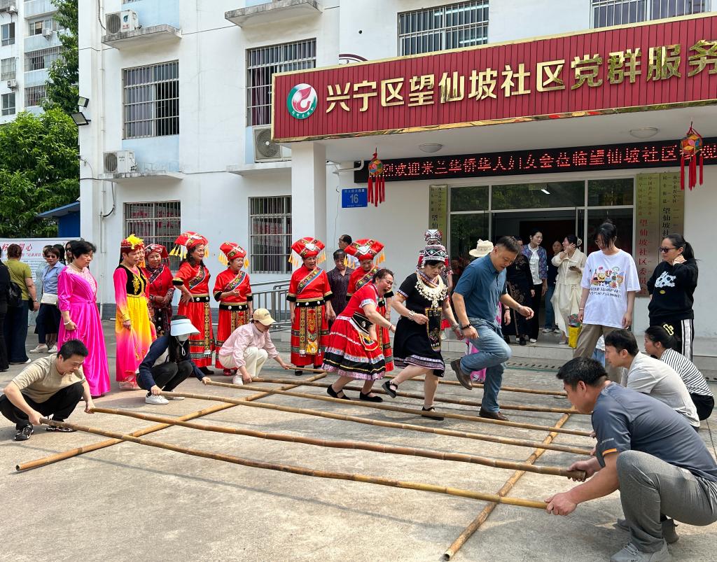 当日早上,在望仙坡社区,社区民众与海外侨胞们一同跳起竹竿舞、对山歌、打油茶,一起品尝五色糯米饭等广西特色美食,沉浸式感受三月三民俗文化。