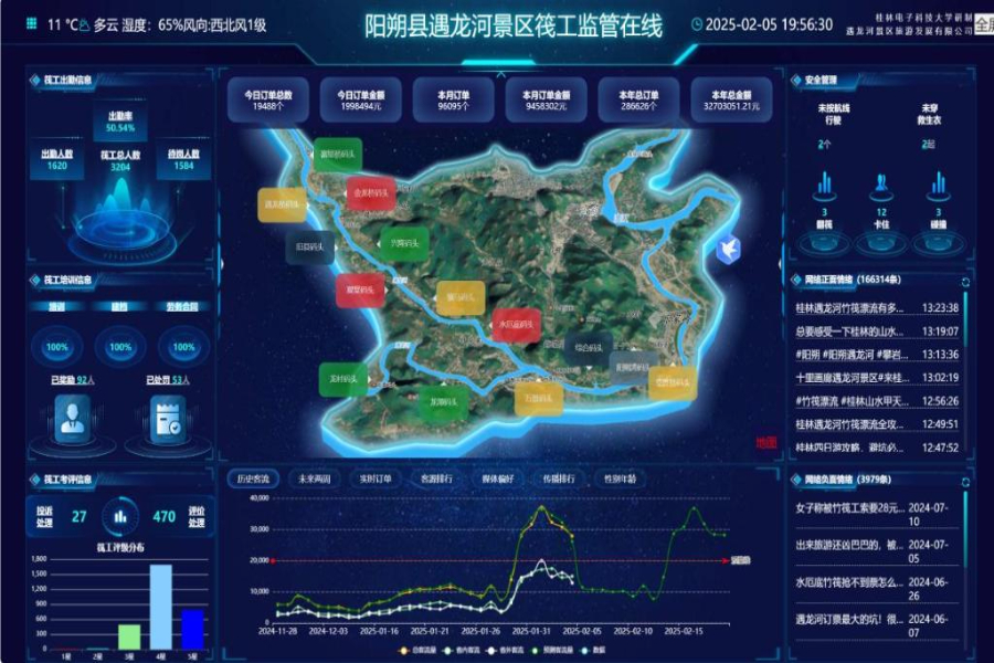桂电计算机与信息安全学院陈金龙教授团队针对工人智能场景创新应用方面研发了桂林全域旅游景区客流大数据监测平台。该平台突破复杂环境下人体目标识别技术,实现客流量监控和分析、热点路径分析、客流预测、大数据研判、时空分析、轨迹刻画、旅游安全管理、应急决策支持等。目前,该平台已在阳朔遇龙河景区应用,有效提升了景区数智化管理水平。
