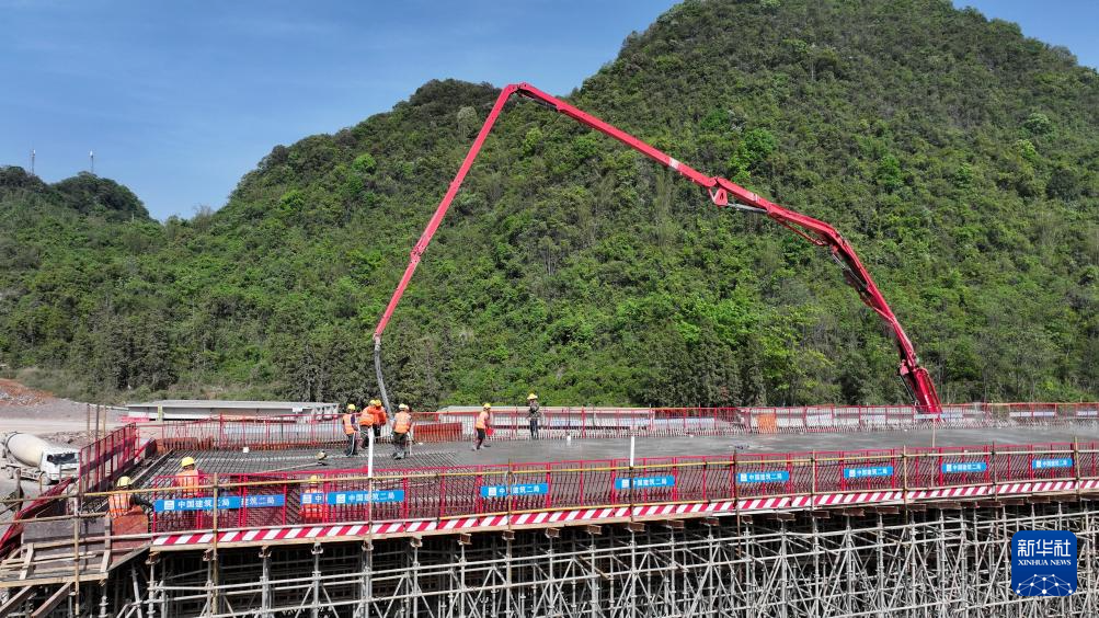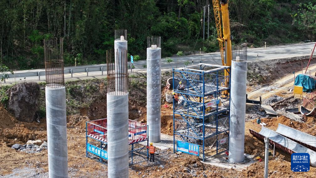 4月14日,工人在融福高速公路广西融安县泗顶镇万安互通建设工地施工作业(无人机照片)。
