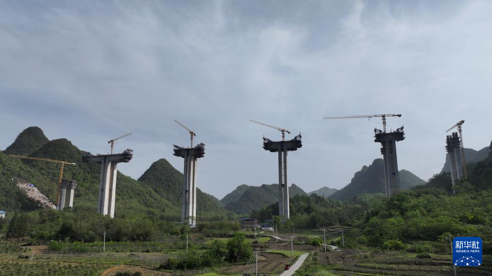 4月14日,工人在融福高速公路广西融安县泗顶镇桐木河特大桥建设工地施工作业(无人机照片)。