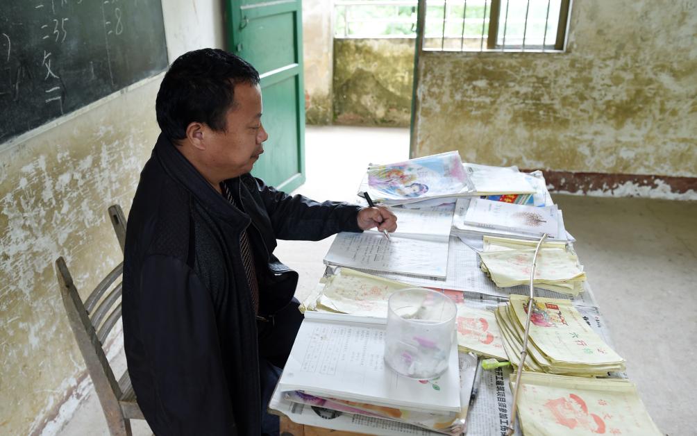 2016年4月26日,在广西全州县白宝乡北山村小学,唐广芳老师在给学生批改作业。