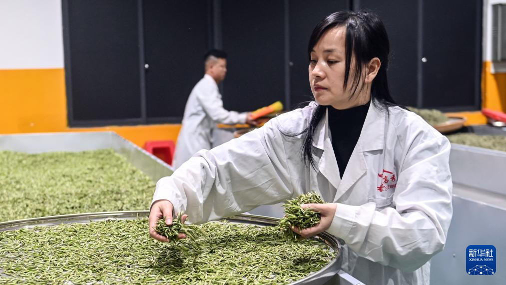曹丽琼在三江御香茶业有限公司制茶车间制作早春茶(3月23日摄)。