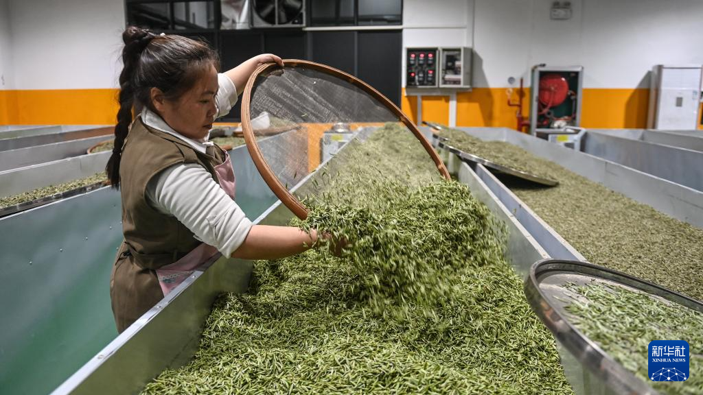 工人在曹丽琼经营的三江御香茶业有限公司制茶车间制作早春茶(3月23日摄)。