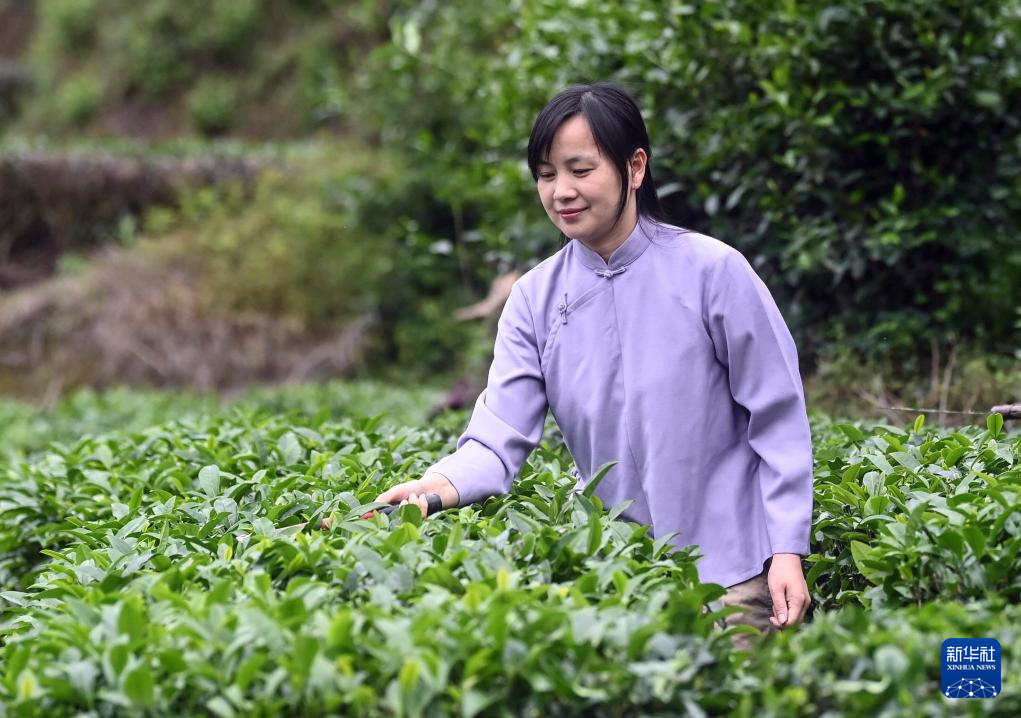 曹丽琼在三江县光辉村茶园查看茶叶生长情况(4月24日摄)。
