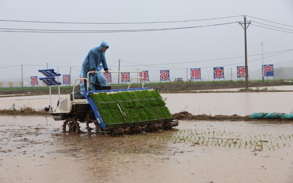 图为平桂区福稻天下粮食产业示范区,农机手驾驶插秧机在雨中插秧