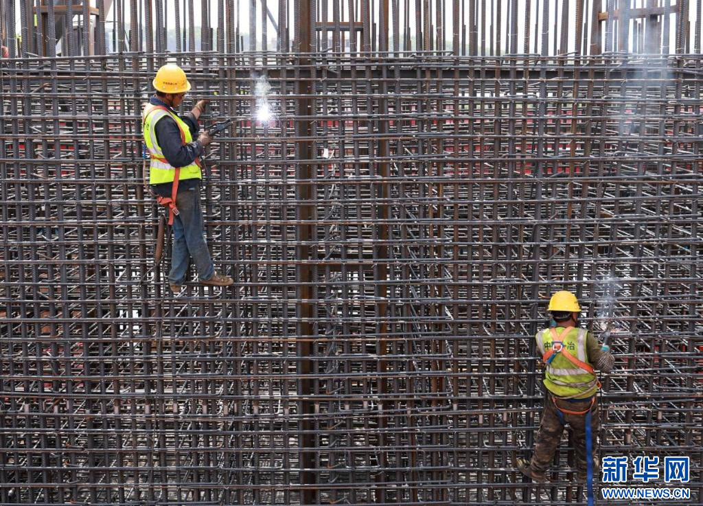 5月2日,柳州高速过境线公路(罗城经柳城至鹿寨段)项目的融江特大桥施工现场,工人正在进行桥墩施工。黄云 摄