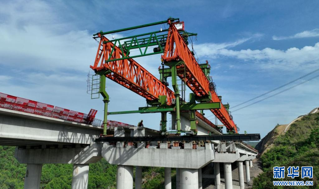 5月1日,在柳州高速过境线公路(罗城经柳城至鹿寨段)项目的品水1号大桥,工人们正在紧张有序地进行吊装预制梁作业。黄云 摄
