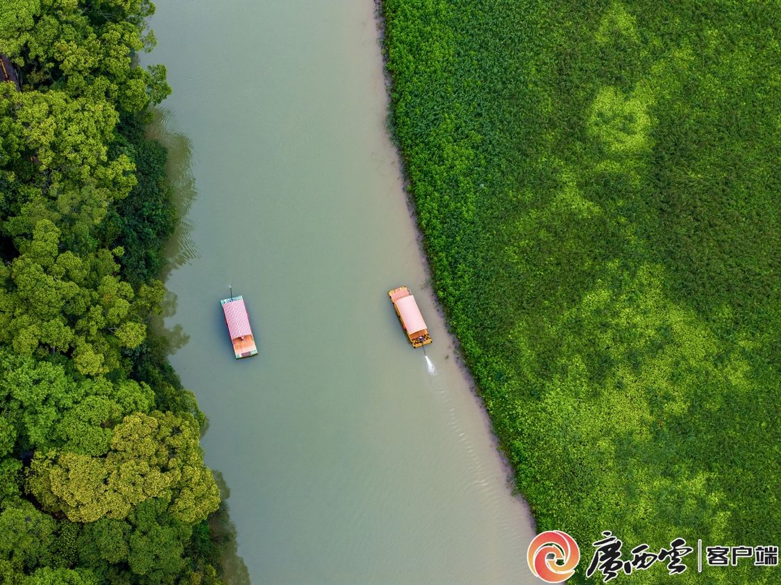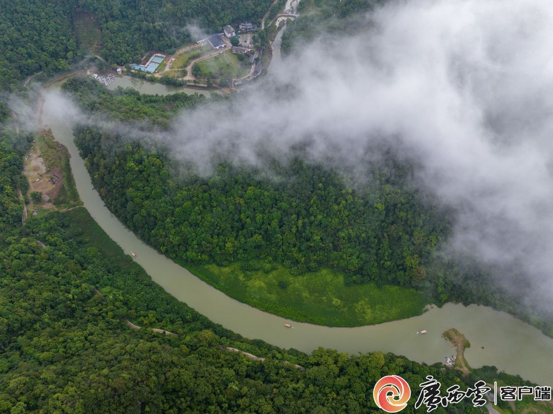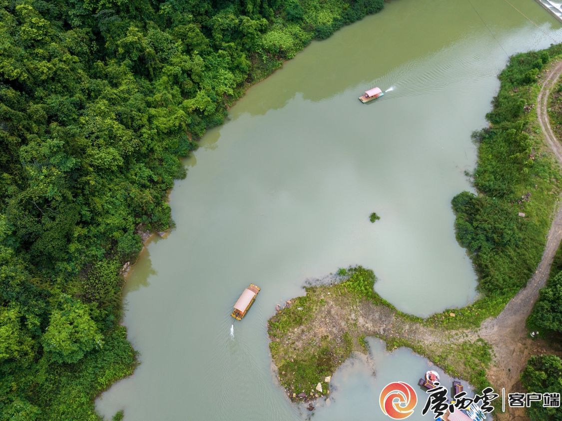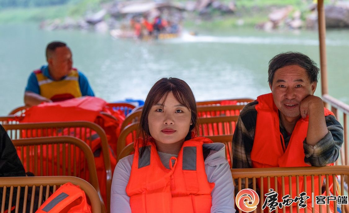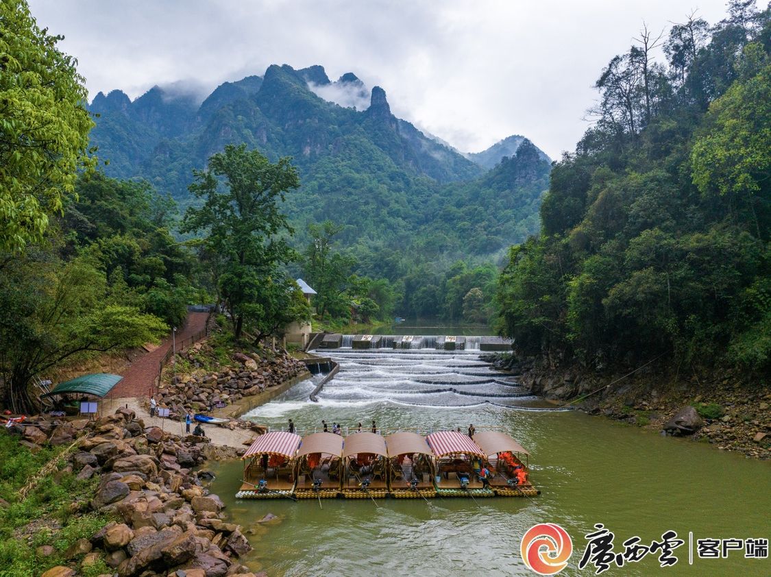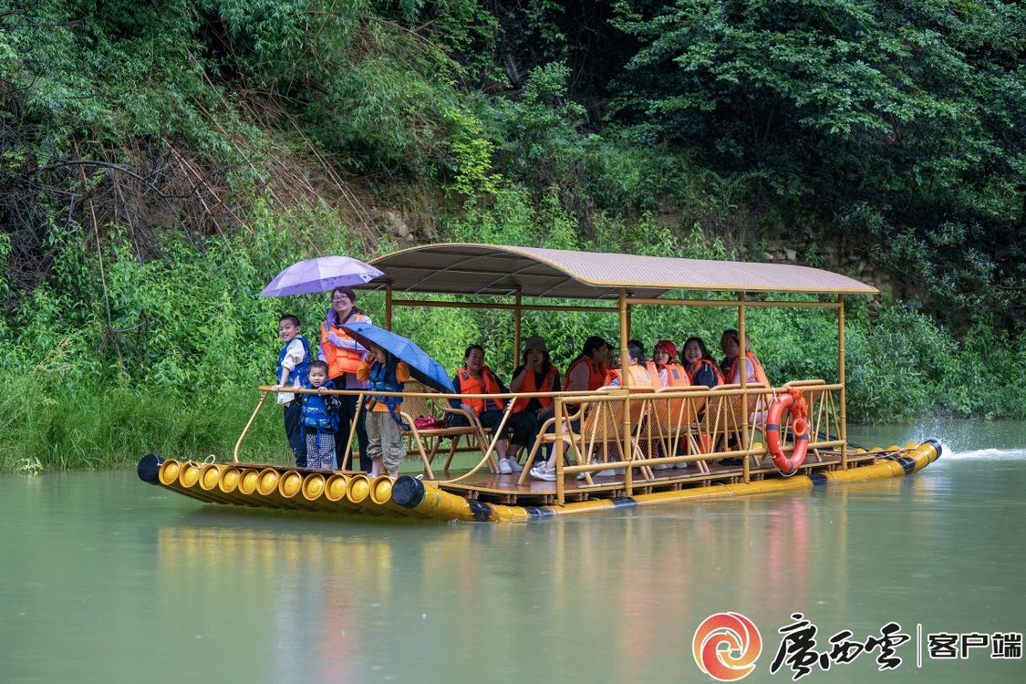 5月10日,在来宾市金秀瑶族自治县长垌乡圣堂湖景区里,游客乘坐竹筏游玩,感受山水自然之美。