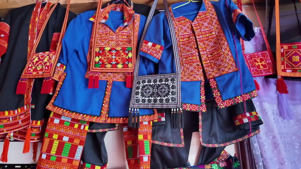 赵凤香从小学习织绣,她介绍,瑶族女孩服饰以红色为主,搭配黄、蓝等鲜艳色彩;男孩服饰则以素色为主,风格简洁。瑶族新娘嫁衣,制作一套需要三年的时间。工作室里一个绣着九朵韭菜花的背袋引人注目,赵凤香说:“这是过去瑶族姑娘的定情信物,九朵花代表爱情长长久久。”