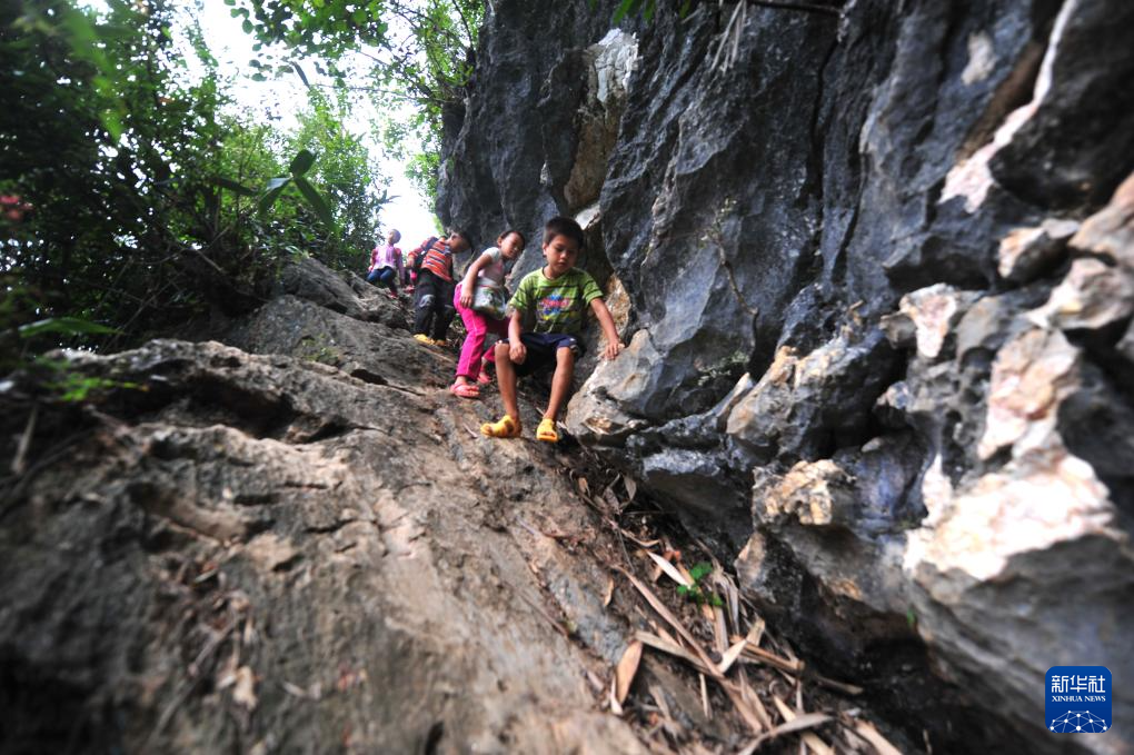 在广西大化瑶族自治县板升乡弄雷村哈宝屯,10岁的蒙富松(左一)爬悬崖去学校读书(2012年9月3日摄)。