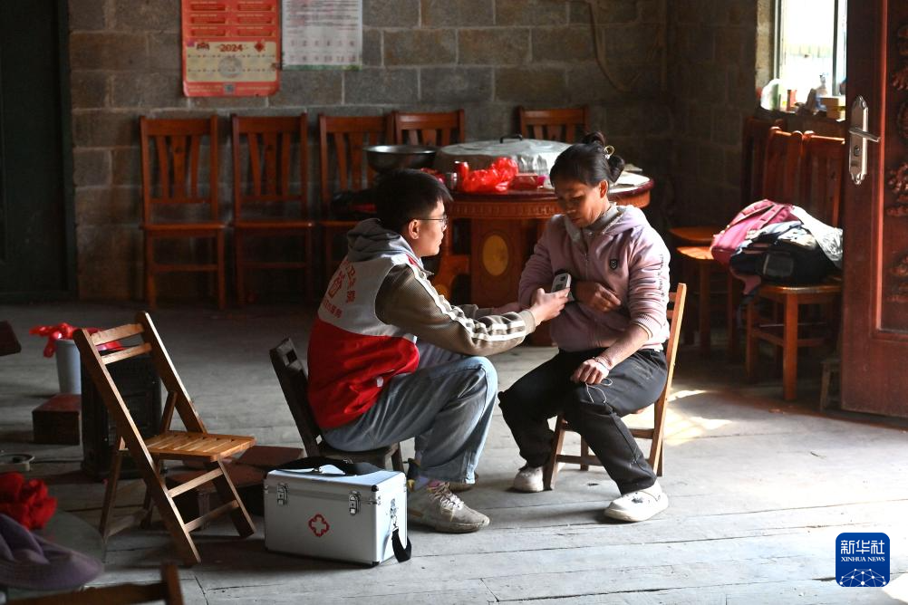 在广西大化瑶族自治县板升乡弄雷村,村医蒙富松进村入户给村民看病(2025年1月19日摄)。