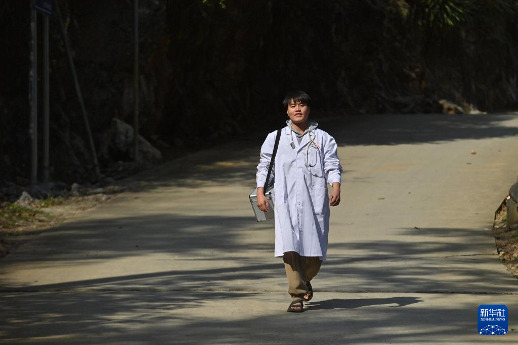 在广西大化瑶族自治县板升乡弄雷村,村医蒙富松准备进村入户给村民看病(2024年3月6日摄)。