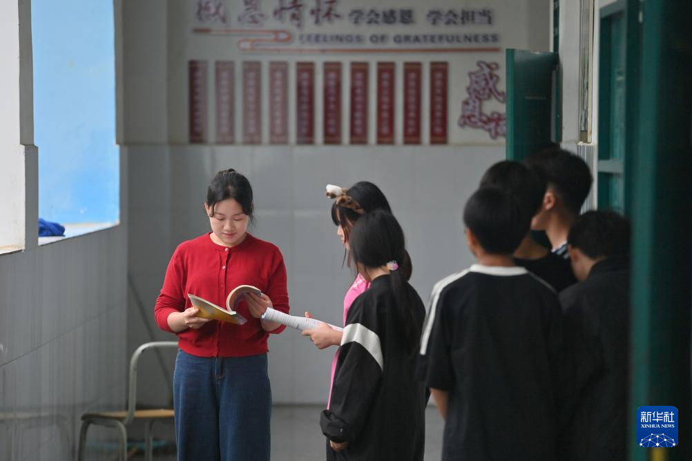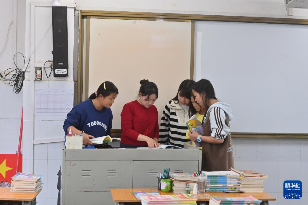 在广西大化瑶族自治县板升乡初级中学,蒙秋艳(左二)辅导学生学习(2025年5月27日摄)。
