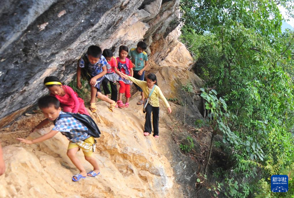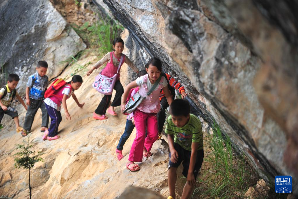 在广西大化瑶族自治县板升乡弄雷村哈宝屯,11岁的蒙秋艳(右二)攀爬悬崖去上学(2012年9月5日摄)。