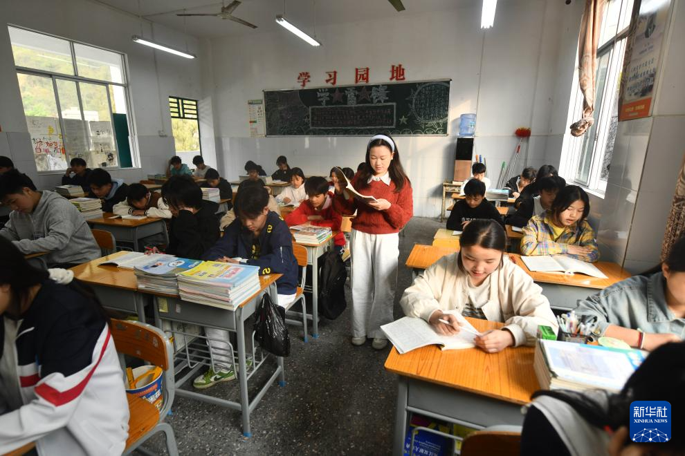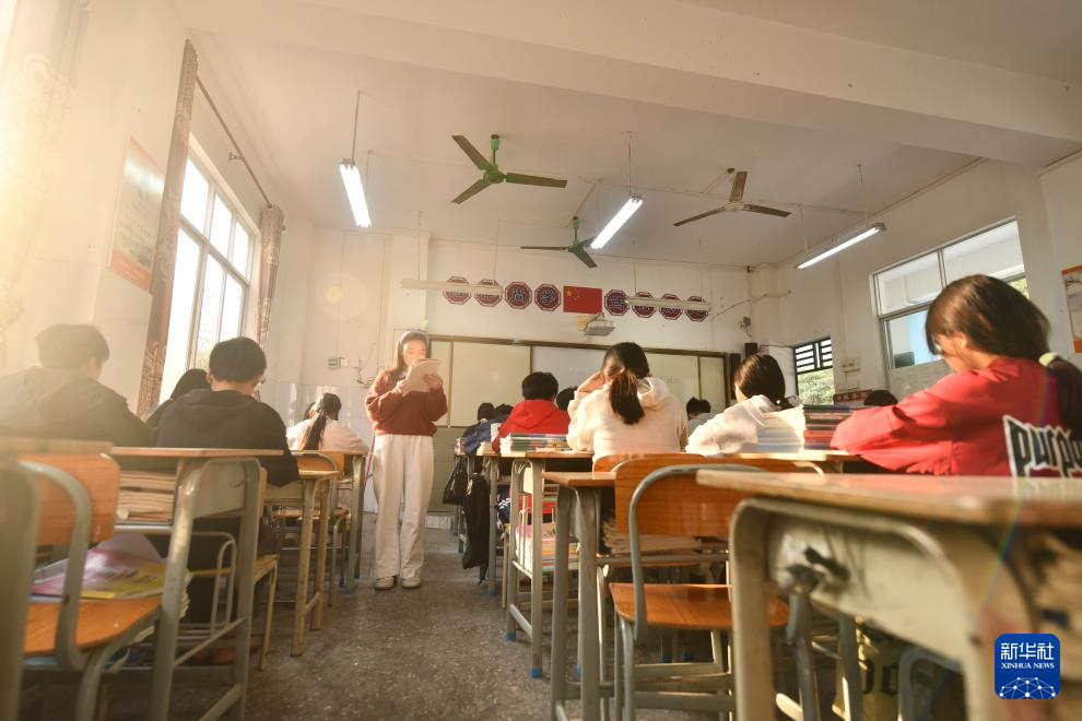 蒙秋艳在广西大化瑶族自治县板升乡初级中学上课(2025年4月2日摄)。