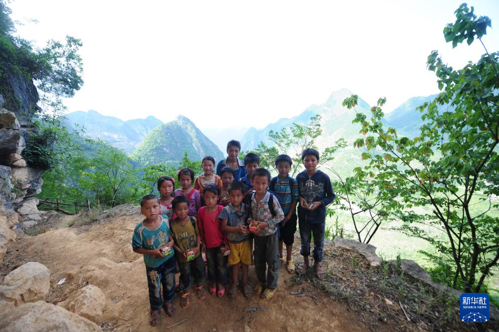 广西大化瑶族自治县板升乡弄雷村哈宝屯,12岁的蒙秋艳(后排左三)和小伙伴们在悬崖边合影(2013年5月28日摄)。