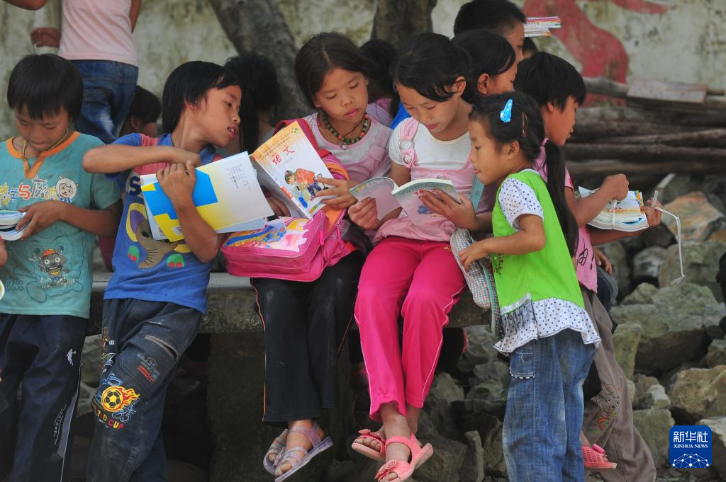 在广西大化瑶族自治县板升乡弄雷小学,11岁的蒙秋艳(右二)在校园里学习(2012年9月5日摄)。