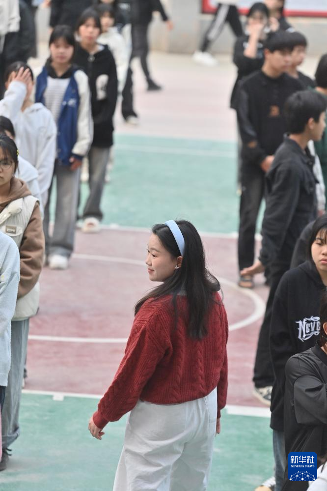 在广西大化瑶族自治县板升乡初级中学大课间,蒙秋艳指导学生开展体育活动(2025年4月2日摄)。