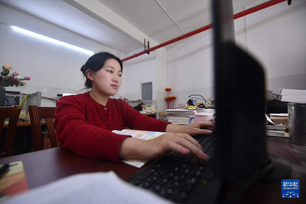蒙秋艳在广西大化瑶族自治县板升乡初级中学的办公室备课(2025年5月27日摄)。