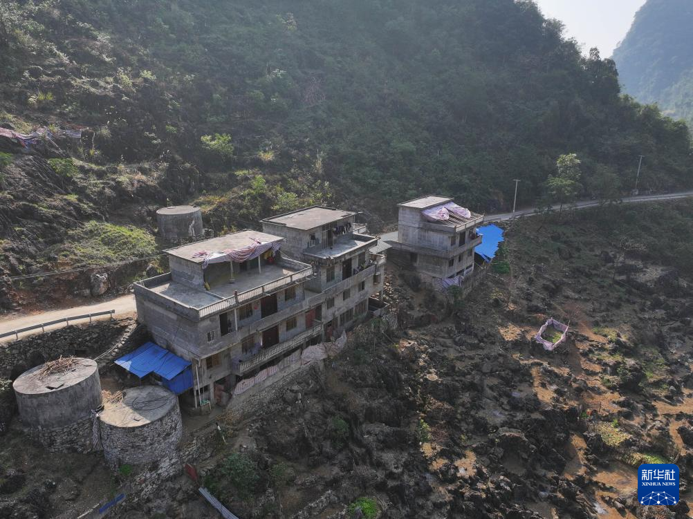 在广西大化瑶族自治县板升乡弄雷村哈宝屯,蒙秋艳的家(左一)已经搬迁至公路边(无人机照片,2025年1月20日摄)。