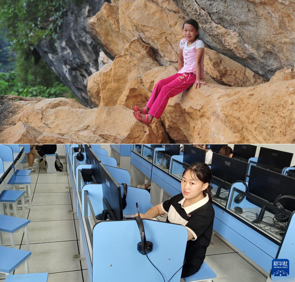 拼版照片:上图为2012年9月5日,11岁的蒙秋艳在在广西大化瑶族自治县板升乡弄雷村哈宝屯的悬崖边休息(新华社记者黄孝邦摄);下图为2022年9月5日,蒙秋艳在广西医科大学语音室学习(新华社发 韦婷婷摄)。