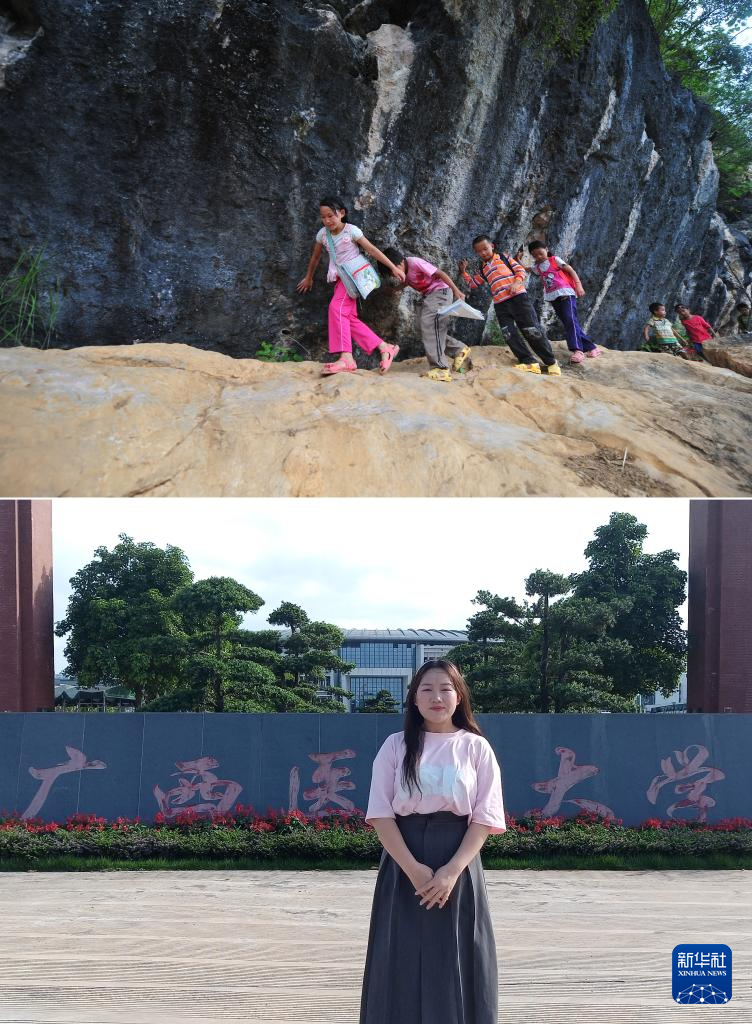 拼版照片:上图为2012年9月5日,在广西大化瑶族自治县板升乡弄雷村哈宝屯,11岁的蒙秋艳(左一)攀爬悬崖回家;下图为2023年5月27日,22岁的蒙秋艳站在她就读的广西医科大学校门口留影。
