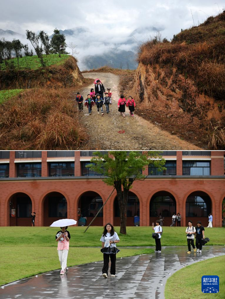 拼版照片。上图:在广西龙胜各族自治县龙脊镇江柳村,余茂鲜(右三)和老师同学走在去学校的路上(2013年2月26日摄)。下图:在桂林信息科技学院,余茂鲜(前排左一)和同学在课堂上听课(2025年5月29日摄)。