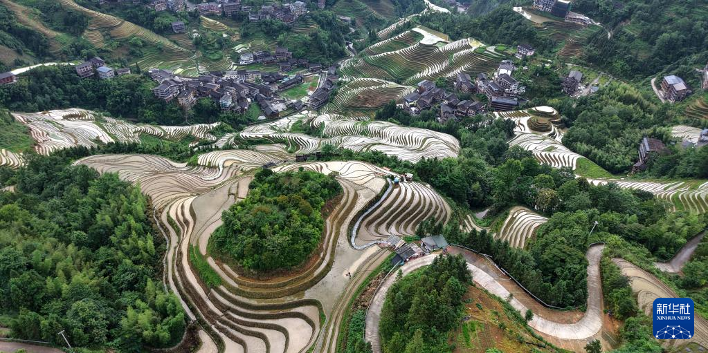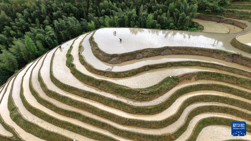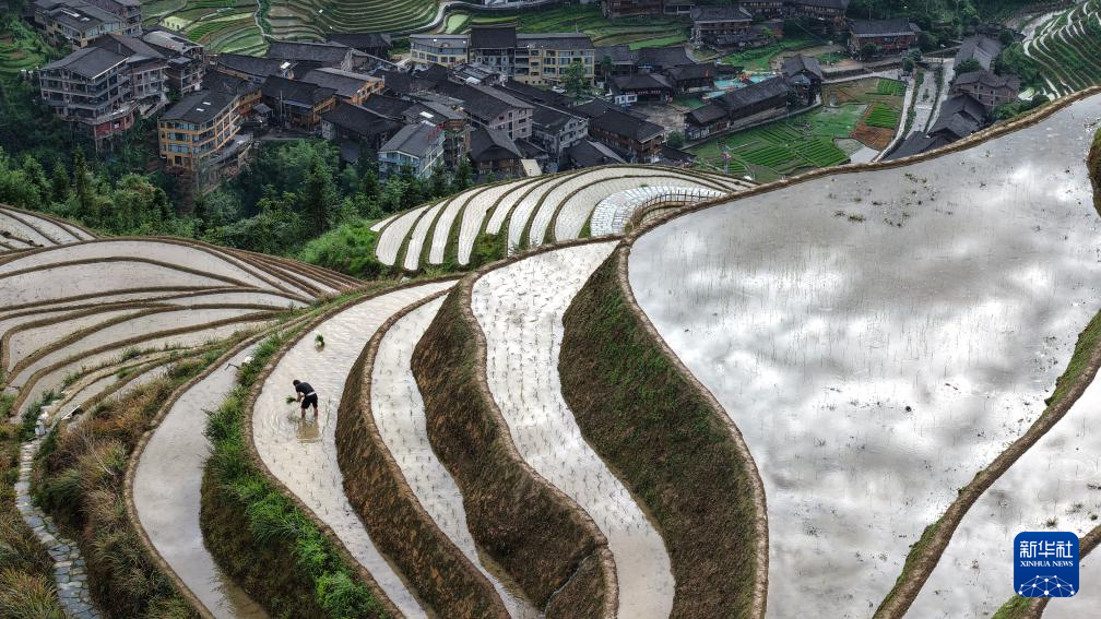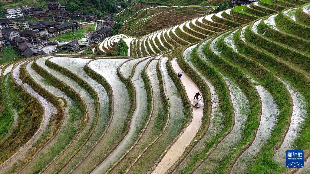 连日来,广西桂林市龙胜各族自治县龙脊梯田辖区内的各村寨进入夏种农忙时节,村民忙着耙田、插秧,梯田上一派忙碌景象。