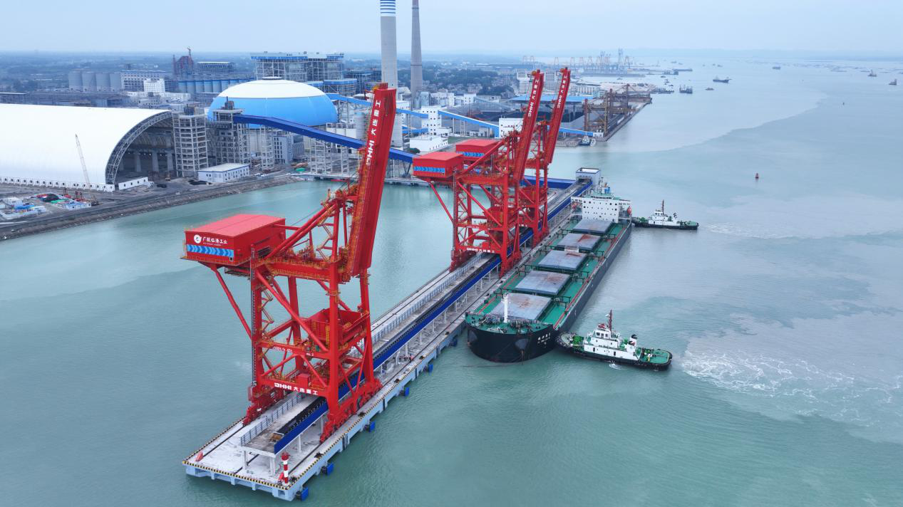 广投临港码头采用高桩码头结构形式,岸线长度361.5米,设计年通过能力988万吨,距离后方堆场及氧化铝生产环节仅300余米,拥有先进的装卸设备和完善的配套设施,配置3台(单台卸船额定能力2500t/h)桥式抓斗式自动化、无人化卸船机,可实现“抓料卸船、堆取料输运”的全流程智慧化操作。