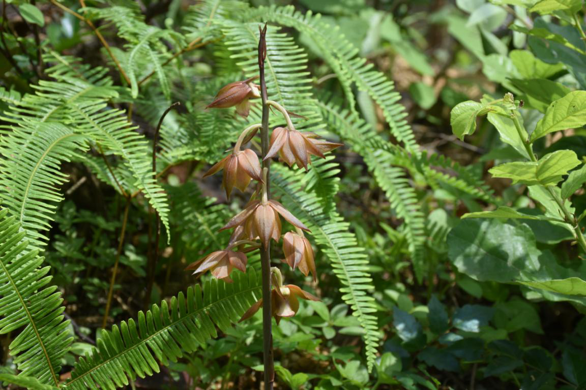 经现场实地观测,这9株无叶美冠兰身姿挺拔,褐红色花茎纤细劲挺,株高介于20至40厘米之间;单株着生花苞6至15枚不等,部分花苞紧裹呈椭圆状待放,部分已完全舒展绽放。唇瓣与花瓣层叠有序,于山野间萦绕着清雅香气。其植株形态与周边灌丛浑然一体,展现出野生兰科植物对生态环境的高度适应性,以不加雕琢的自然姿态,诠释“野性”之美的生态意蕴。