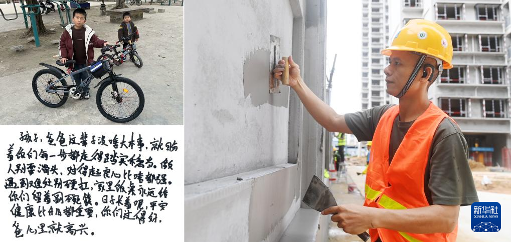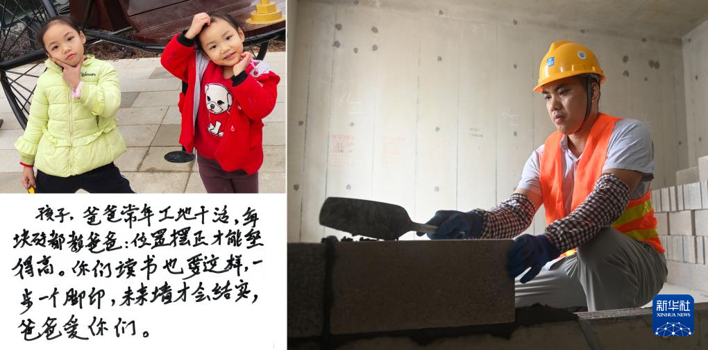 拼版照片:右图为6月12日,在广西南宁市明秀东路一个危旧房改住房项目建设工地上,中建三局二公司工人杨发报在砌砖;左上图为杨发报手机里保存的自己孩子的照片(受访者供图);左下图为杨发报写给自己孩子的寄语。