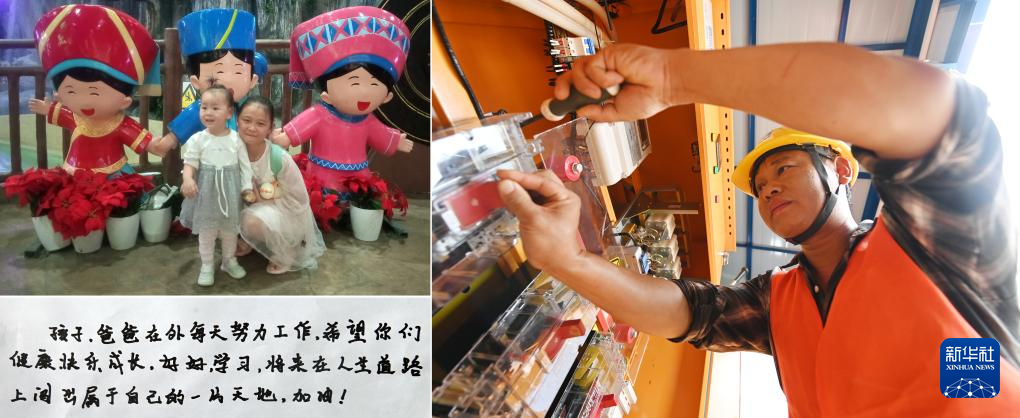 拼版照片:右图为6月12日,在广西南宁市新中新零售供应链基地项目建设工地上,中建三局二公司工人王俊林在维护供电设施;左上图为王俊林手机里保存的自己小孩的照片(受访者供图);左下图为王俊林写给自己孩子的寄语。
