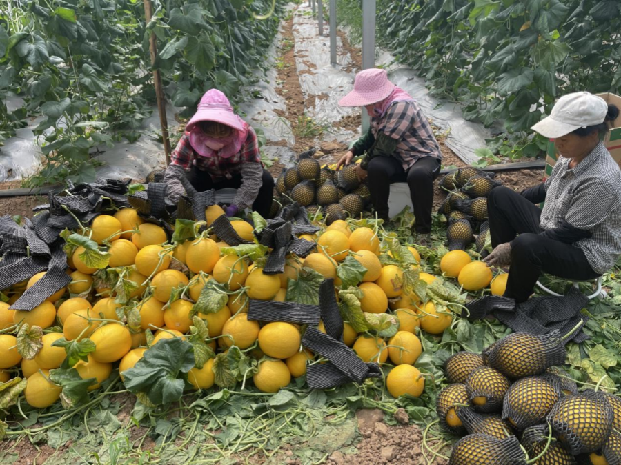 在南阳镇特色农业种植基地,大棚内绿意盎然,藤蔓间挂满了圆润饱满的甜瓜,正值丰收季,农户们忙碌地采摘、分拣、装箱,一派丰收的景象。