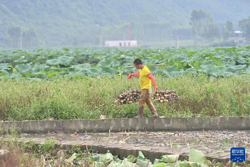 在柳州市柳江区百朋镇怀洪村万亩莲藕种植基地,村民在采收莲藕(6月17日摄)。