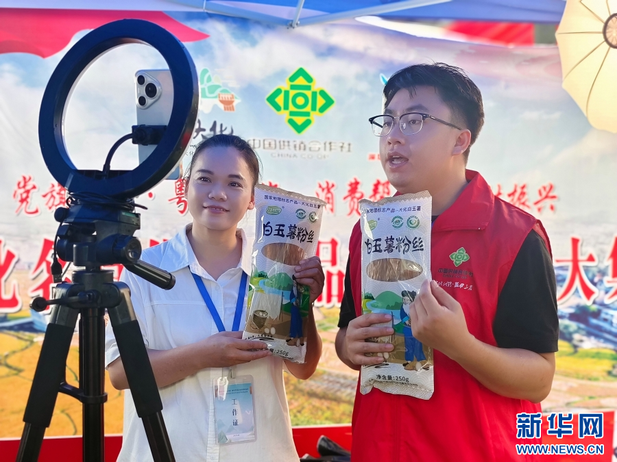 农市大集直播活动上,主播正在推介大化特色农产品。新华网发 高东风 摄