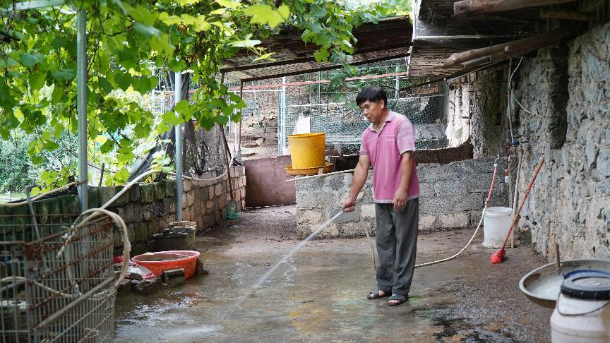 韦孟流在清洗自家庭院。